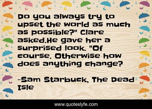 This page presents the quote "Do you always try to upset the world as much as possible?" Clare asked.He gave her a surprised look. "Of course. Otherwise how does anything change?". Author of this quote is Sam Starbuck, The Dead Isle. This quote is about upset, change,.