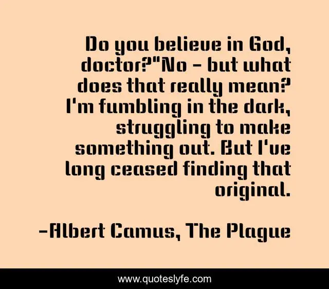 This page presents the quote "Do you believe in God, doctor?"No - but what does that really mean? I'm fumbling in the dark, struggling to make something out. But I've long ceased finding that original.". Author of this quote is Albert Camus, The Plague. This quote is about religion, philosophy,.