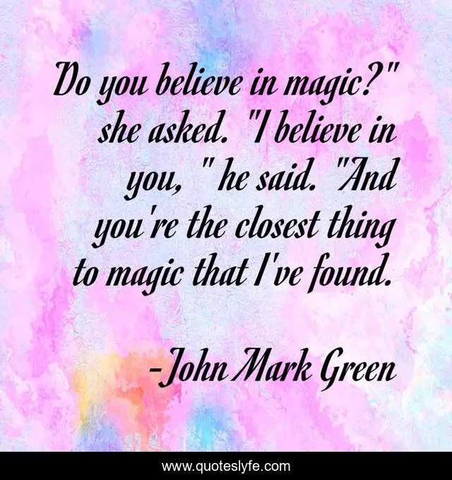 This page presents the quote "Do you believe in magic?" she asked. "I believe in you, " he said. "And you're the closest thing to magic that I've found.". Author of this quote is John Mark Green. This quote is about relationships, true-love, magic, soulmates, poetry, love, affection,.