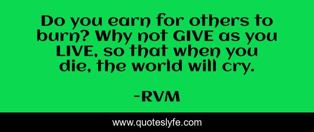 This page presents the quote "Do you earn for others to burn? Why not GIVE as you LIVE, so that when you die, the world will cry.". Author of this quote is RVM. This quote is about motivation, inspiration,.