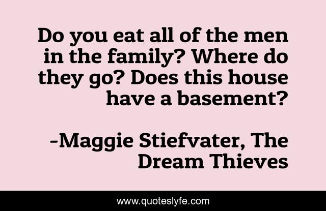 This page presents the quote "Do you eat all of the men in the family? Where do they go? Does this house have a basement?". Author of this quote is Maggie Stiefvater, The Dream Thieves. This quote is about absence, men,.