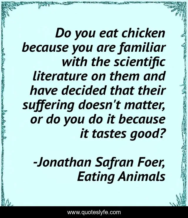 "Jonathan Safran Foer, Eating Animals Quotes." Quoteslyfe.com, 2025. Tue. 09 Dec. 2025. <https://www.quoteslyfe.com/quote/Do-you-eat-chicken-because-you-are-207261>.