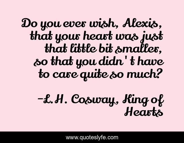 This page presents the quote "Do you ever wish, Alexis, that your heart was just that little bit smaller, so that you didn't have to care quite so much?". Author of this quote is L.H. Cosway, King of Hearts. This quote is about heart, oliver, care,.