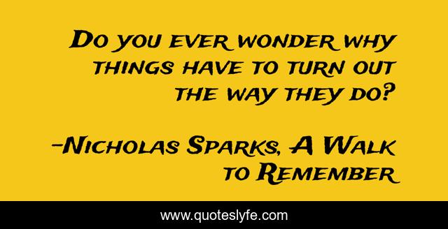 This page presents the quote "Do you ever wonder why things have to turn out the way they do?". Author of this quote is Nicholas Sparks, A Walk to Remember. This quote is about destiny, fate, wonder,.