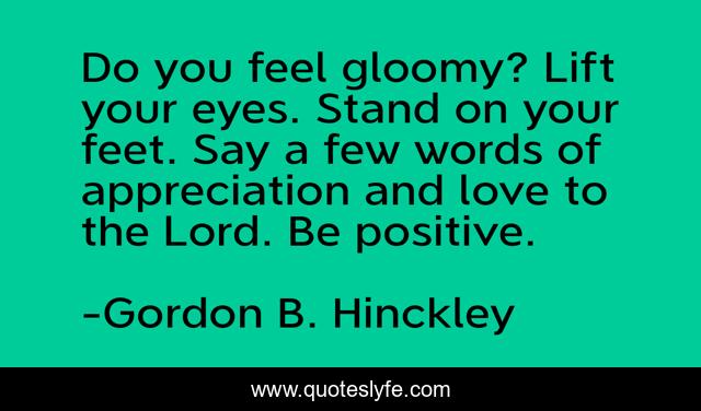 This page presents the quote "Do you feel gloomy? Lift your eyes. Stand on your feet. Say a few words of appreciation and love to the Lord. Be positive.". Author of this quote is Gordon B. Hinckley. This quote is about appreciation, eyes, love, affection,.