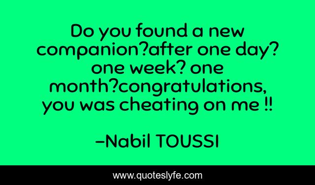 This page presents the quote "Do you found a new companion?after one day? one week? one month?congratulations, you was cheating on me !!". Author of this quote is Nabil TOUSSI. This quote is about sadness, cheating, love, cheated, affection,.