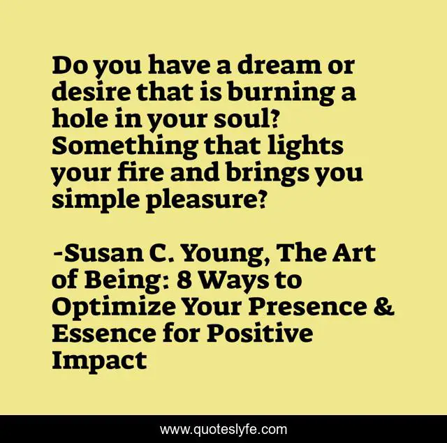 This page presents the quote "Do you have a dream or desire that is burning a hole in your soul? Something that lights your fire and brings you simple pleasure?". Author of this quote is Susan C. Young, The Art of Being: 8 Ways to Optimize Your Presence & Essence for Positive Impact. This quote is about confidence, susan-young, relationship, communication-skills, passionate-living, communication, first-impressions, authenticity, integrity,.