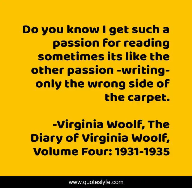 This page presents the quote "Do you know I get such a passion for reading sometimes its like the other passion -writing- only the wrong side of the carpet.". Author of this quote is Virginia Woolf, The Diary of Virginia Woolf, Volume Four: 1931-1935. This quote is about reading, letters, writing,.