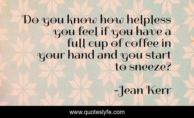 This page presents the quote "Do you know how helpless you feel if you have a full cup of coffee in your hand and you start to sneeze?". Author of this quote is Jean Kerr. This quote is about coffee, humor,.