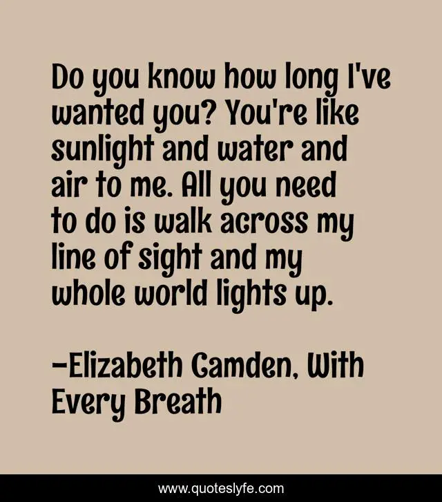 This page presents the quote "Do you know how long I've wanted you? You're like sunlight and water and air to me. All you need to do is walk across my line of sight and my whole world lights up.". Author of this quote is Elizabeth Camden, With Every Breath. This quote is about world, love, sunlight, affection, air,.