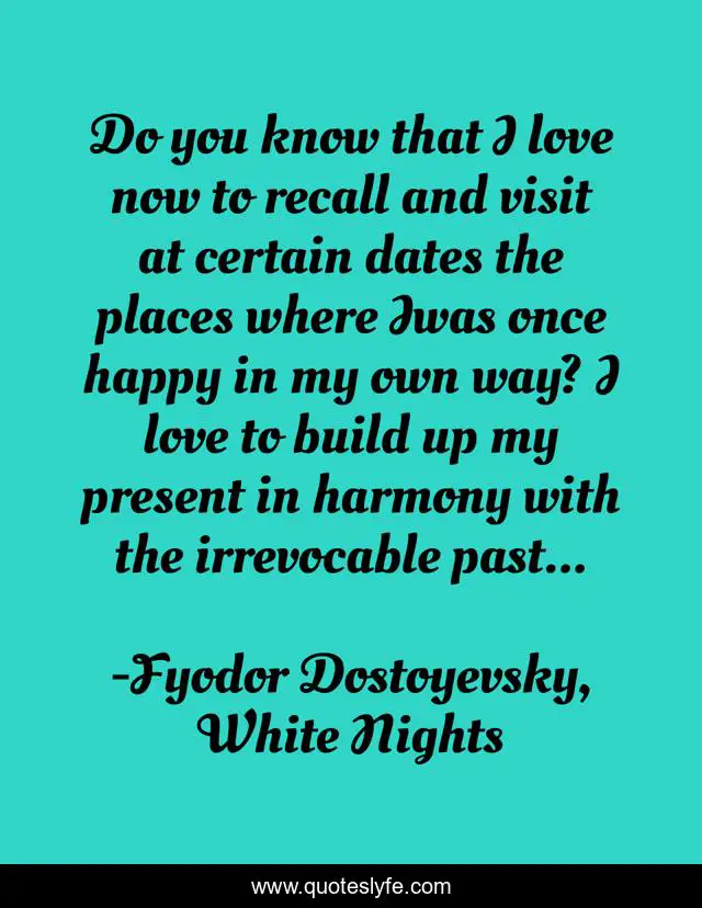 This page presents the quote "Do you know that I love now to recall and visit at certain dates the places where Iwas once happy in my own way? I love to build up my present in harmony with the irrevocable past...". Author of this quote is Fyodor Dostoyevsky, White Nights. This quote is about past, present,.