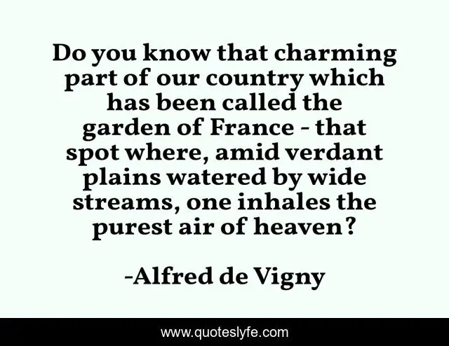 This page presents the quote "Do you know that charming part of our country which has been called the garden of France - that spot where, amid verdant plains watered by wide streams, one inhales the purest air of heaven?". Author of this quote is Alfred de Vigny. .