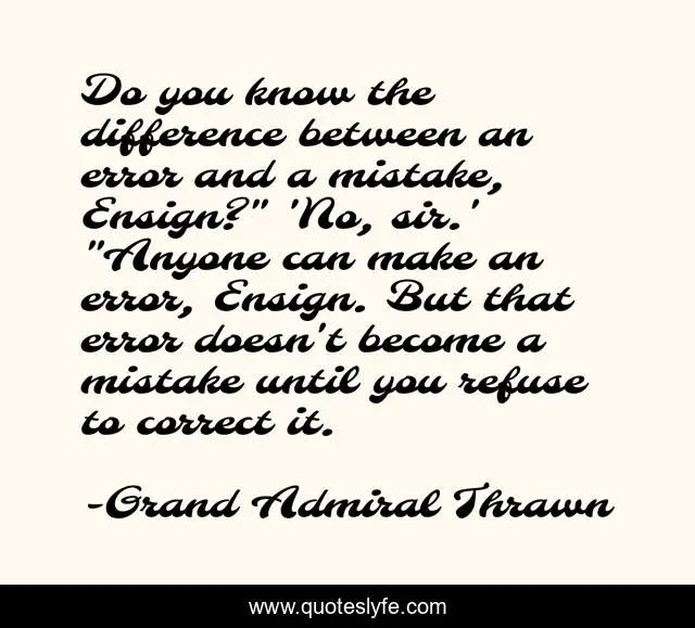 This page presents the quote "Do you know the difference between an error and a mistake, Ensign?" 'No, sir.' "Anyone can make an error, Ensign. But that error doesn't become a mistake until you refuse to correct it.". Author of this quote is Grand Admiral Thrawn. .