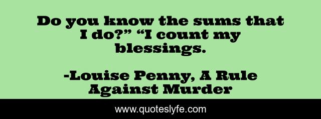 This page presents the quote "Do you know the sums that I do?” “I count my blessings.". Author of this quote is Louise Penny, A Rule Against Murder. This quote is about count-your-blessings, blessings, finney,.