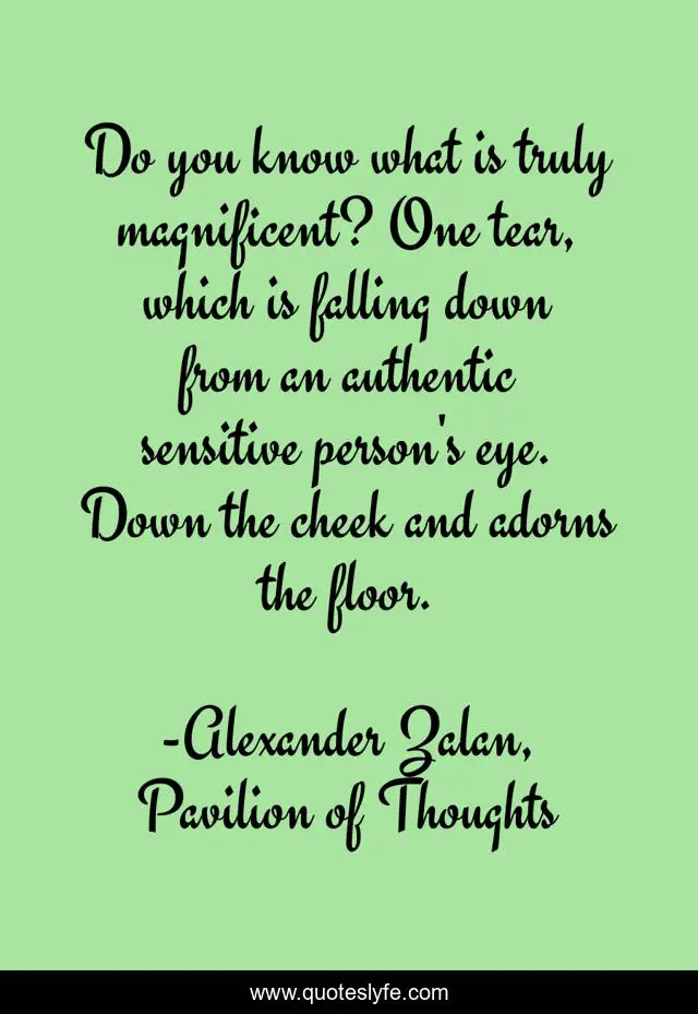 This page presents the quote "Do you know what is truly magnificent? One tear, which is falling down from an authentic sensitive person's eye. Down the cheek and adorns the floor.". Author of this quote is Alexander Zalan, Pavilion of Thoughts. This quote is about tear, emotions, aestheticism,.