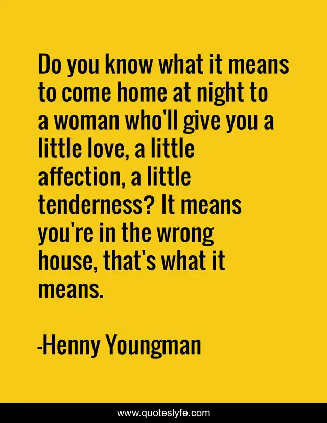 This page presents the quote "Do you know what it means to come home at night to a woman who'll give you a little love, a little affection, a little tenderness? It means you're in the wrong house, that's what it means.". Author of this quote is Henny Youngman. This quote is about relationships, funny, men, marriage, comedy, women,.