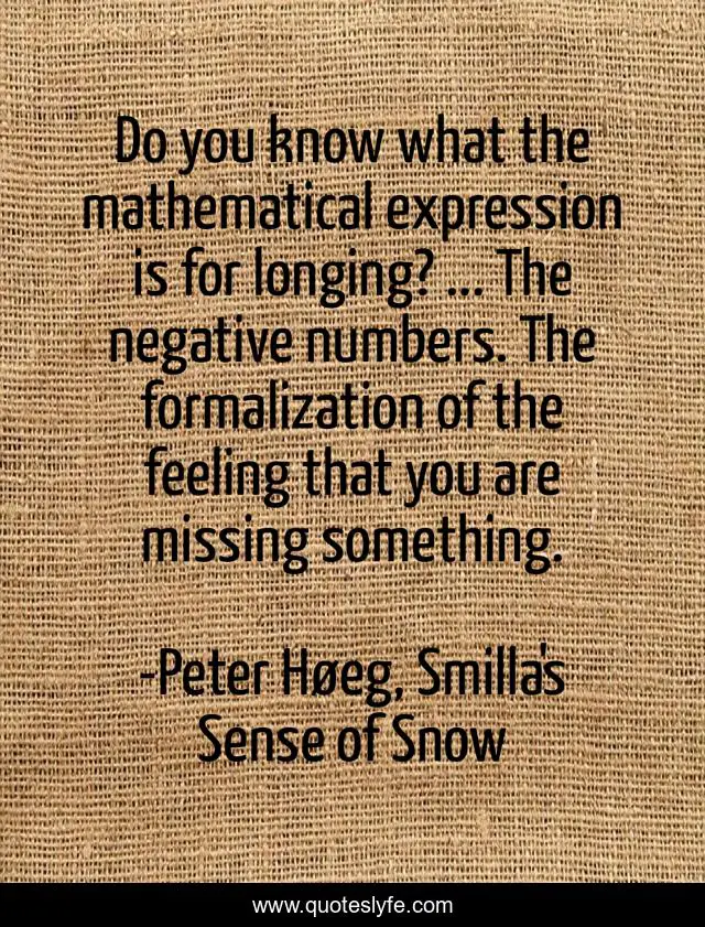 This page presents the quote "Do you know what the mathematical expression is for longing? ... The negative numbers. The formalization of the feeling that you are missing something.". Author of this quote is Peter Høeg, Smilla's Sense of Snow. This quote is about negative-numbers, longing, lack, mathematics, missing,.