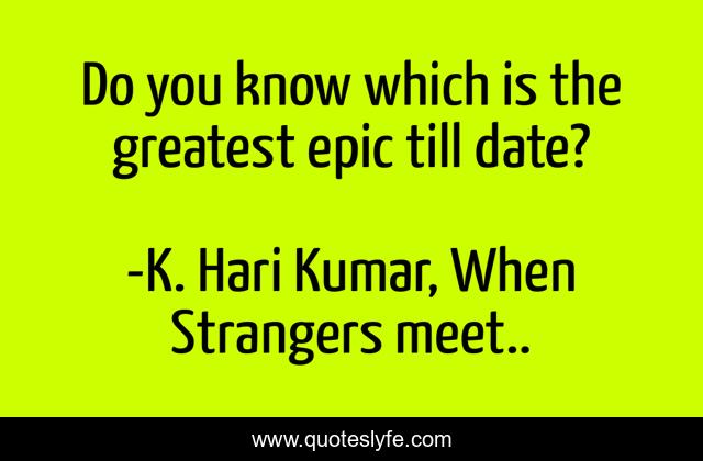 This page presents the quote "Do you know which is the greatest epic till date?". Author of this quote is K. Hari Kumar, When Strangers meet... This quote is about new-delhi, mahabharata, india, ghittorni, inpirational, iyer, story, hindu, stranger-s-tale,.