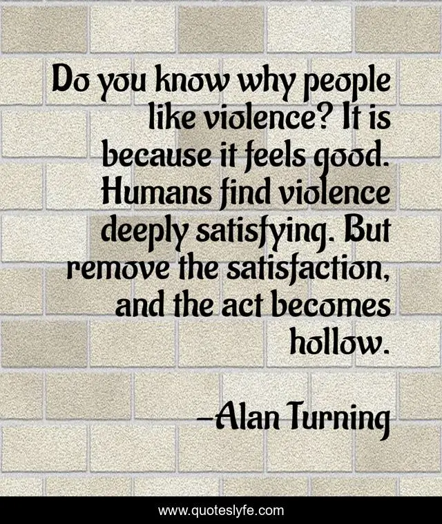 This page presents the quote "Do you know why people like violence? It is because it feels good. Humans find violence deeply satisfying. But remove the satisfaction, and the act becomes hollow.". Author of this quote is Alan Turning. This quote is about satisfaction, violence, humans, hollow,.