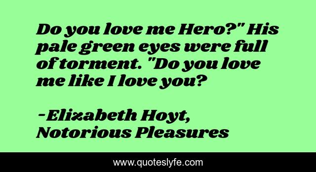 This page presents the quote "Do you love me Hero?" His pale green eyes were full of torment. "Do you love me like I love you?". Author of this quote is Elizabeth Hoyt, Notorious Pleasures. This quote is about relationships, love, torment, affection,.