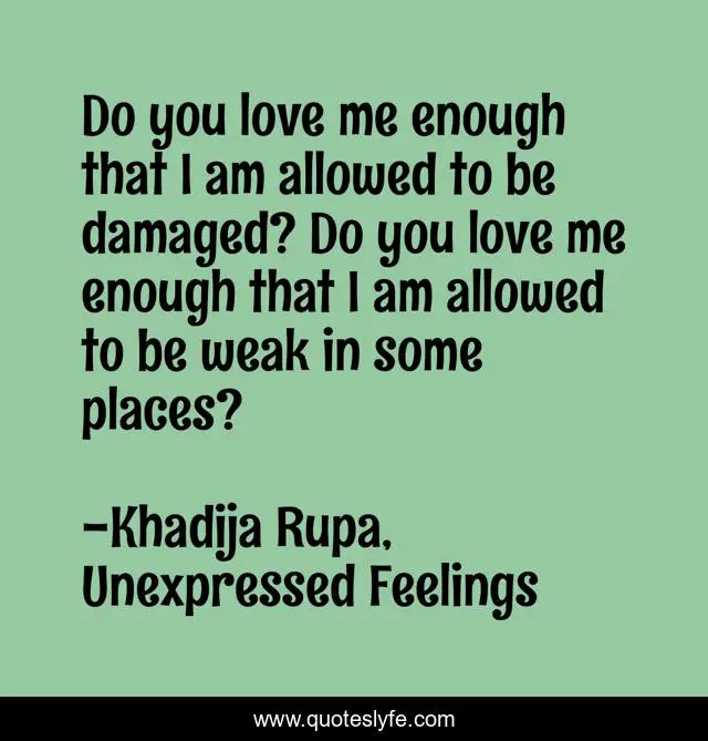 This page presents the quote "Do you love me enough that I am allowed to be damaged? Do you love me enough that I am allowed to be weak in some places?". Author of this quote is Khadija Rupa, Unexpressed Feelings. This quote is about khadija-rupa, love, sadquotes, unexpressed-feelings, sadness, despair, questions, sorrow, affection,.