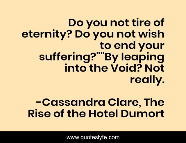 This page presents the quote "Do you not tire of eternity? Do you not wish to end your suffering?""By leaping into the Void? Not really.". Author of this quote is Cassandra Clare, The Rise of the Hotel Dumort. This quote is about eternity, magnus-bane,.