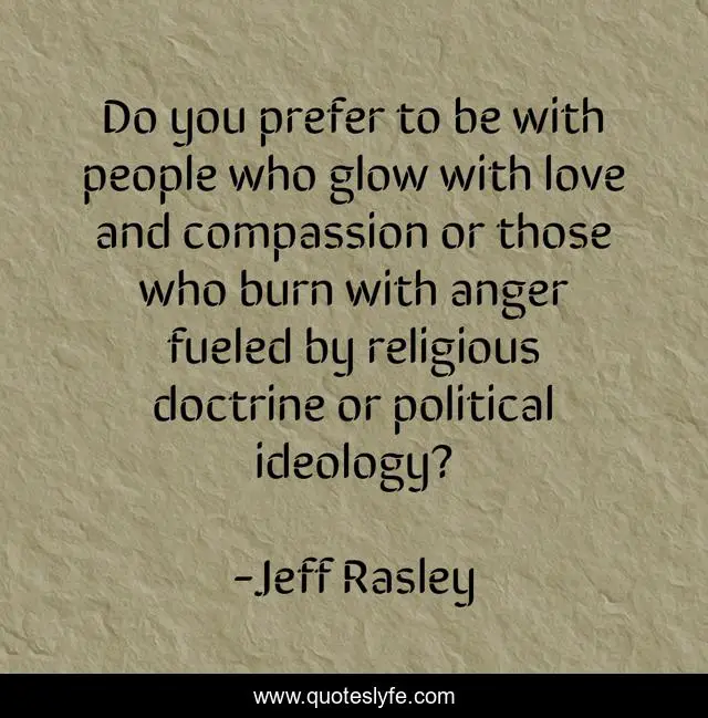This page presents the quote "Do you prefer to be with people who glow with love and compassion or those who burn with anger fueled by religious doctrine or political ideology?". Author of this quote is Jeff Rasley. This quote is about politics, political-commentary, religious-philosophy, political, religion,.