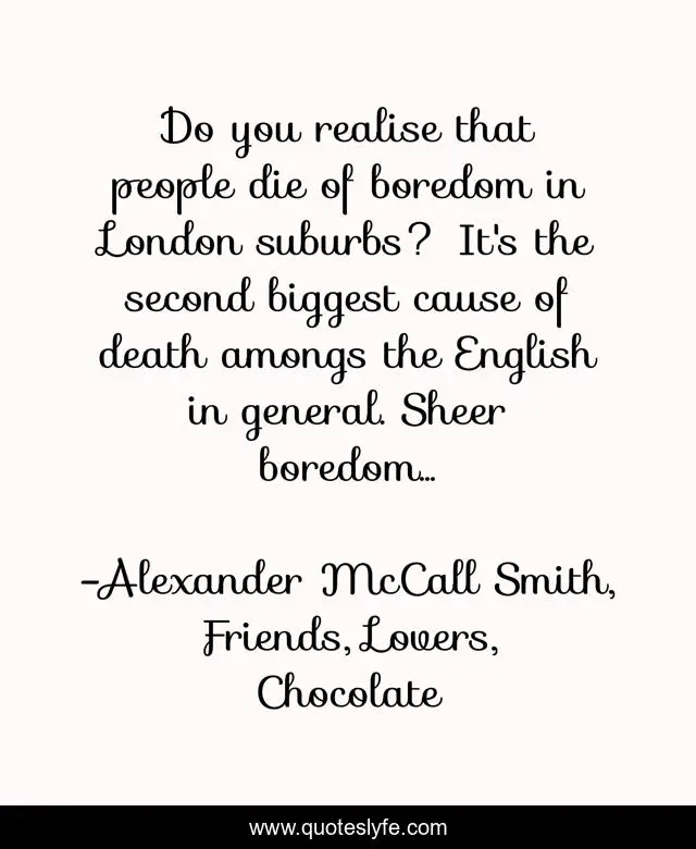 This page presents the quote "Do you realise that people die of boredom in London suburbs? It's the second biggest cause of death amongs the English in general. Sheer boredom...". Author of this quote is Alexander McCall Smith, Friends, Lovers, Chocolate. This quote is about england, death, london, boredom, suburbia,.