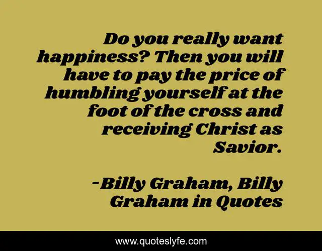 This page presents the quote "Do you really want happiness? Then you will have to pay the price of humbling yourself at the foot of the cross and receiving Christ as Savior.". Author of this quote is Billy Graham, Billy Graham in Quotes. This quote is about happiness, billy-graham,.