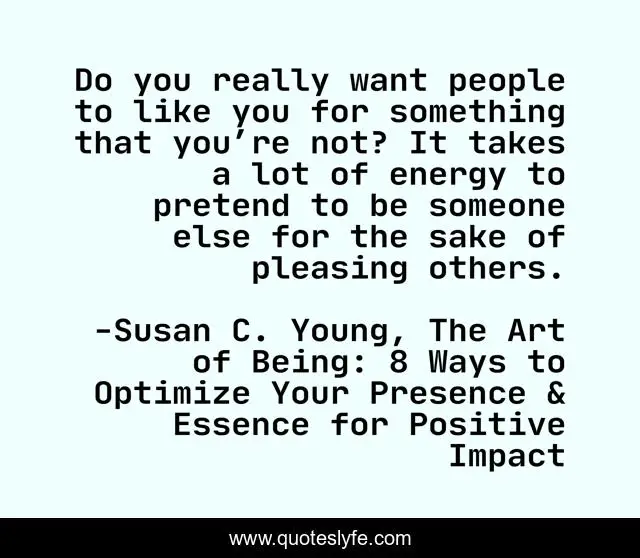 This page presents the quote "Do you really want people to like you for something that you’re not? It takes a lot of energy to pretend to be someone else for the sake of pleasing others.". Author of this quote is Susan C. Young, The Art of Being: 8 Ways to Optimize Your Presence & Essence for Positive Impact. This quote is about social-networking, susan-young, relationship, communication-skills, communication, personality-development, first-impressions, authenticity, trust,.