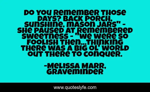 This page presents the quote "Do you remember those days? Back porch, sunshine, mason jars" - she paused at remembered sweetness - "we were so foolish then...thinking there was a big ol' world out there to conquer.". Author of this quote is Melissa Marr, Graveminder. This quote is about past, ageing, remembrance, memory,.