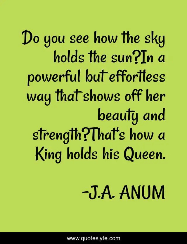 This page presents the quote "Do you see how the sky holds the sun?In a powerful but effortless way that shows off her beauty and strength?That's how a King holds his Queen.". Author of this quote is J.A. ANUM. This quote is about love, queen, relationships, poem, lovers, sun, lifequotes, sky, poetry,.