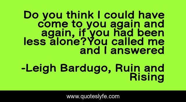 This page presents the quote "Do you think I could have come to you again and again, if you had been less alone?You called me and I answered". Author of this quote is Leigh Bardugo, Ruin and Rising. This quote is about alarkling, the-darkling, lonely, alina-starkov, grisha, ruin-and-rising, darlina, visions,.