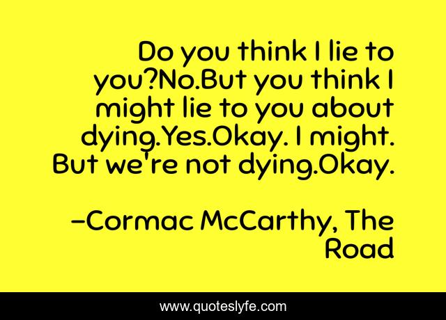 This page presents the quote "Do you think I lie to you?No.But you think I might lie to you about dying.Yes.Okay. I might. But we're not dying.Okay.". Author of this quote is Cormac McCarthy, The Road. This quote is about lies, life, death-and-dying,.