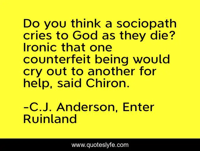 This page presents the quote "Do you think a sociopath cries to God as they die? Ironic that one counterfeit being would cry out to another for help, said Chiron.". Author of this quote is C.J. Anderson, Enter Ruinland. This quote is about atheism, ruinland,.