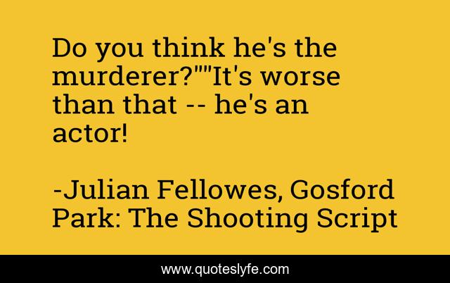 This page presents the quote "Do you think he's the murderer?""It's worse than that -- he's an actor!". Author of this quote is Julian Fellowes, Gosford Park: The Shooting Script. This quote is about perceptions, humor, crime, movies, actors, murderers,.