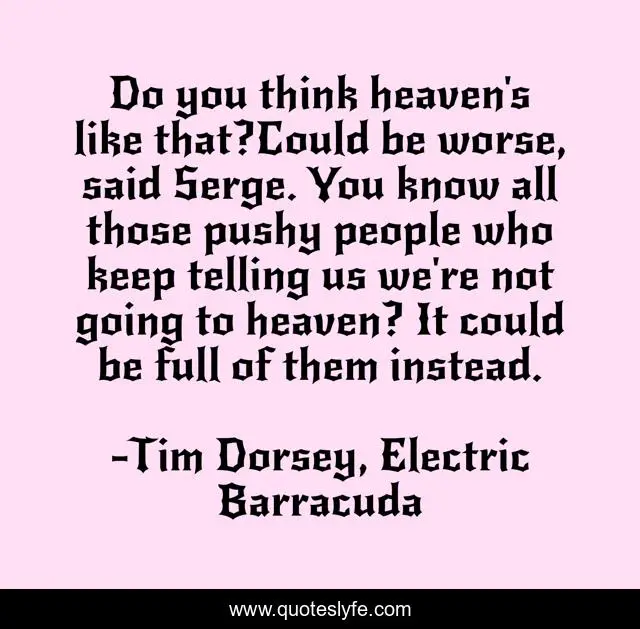 This page presents the quote "Do you think heaven's like that?Could be worse, said Serge. You know all those pushy people who keep telling us we're not going to heaven? It could be full of them instead.". Author of this quote is Tim Dorsey, Electric Barracuda. This quote is about religion, heaven, serge-storms, tim-dorsey,.