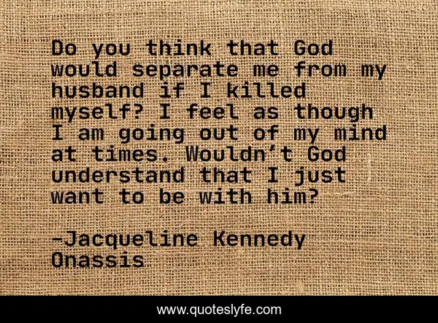 This page presents the quote "Do you think that God would separate me from my husband if I killed myself? I feel as though I am going out of my mind at times. Wouldn’t God understand that I just want to be with him?". Author of this quote is Jacqueline Kennedy Onassis. This quote is about loss, suicide, grieving,.