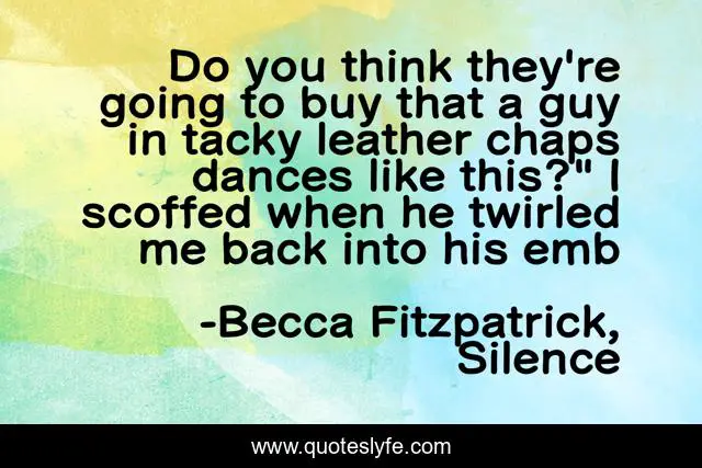 This page presents the quote "Do you think they're going to buy that a guy in tacky leather chaps dances like this?" I scoffed when he twirled me back into his emb". Author of this quote is Becca Fitzpatrick, Silence. This quote is about funny, becca-fitzpatrick, leather-chaps, nora-and-patch, nora-grey, comedy, hush-hush, silence, patch-cipriano,.