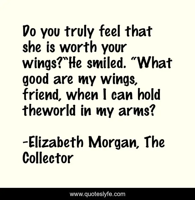 This page presents the quote "Do you truly feel that she is worth your wings?”He smiled. “What good are my wings, friend, when I can hold theworld in my arms?". Author of this quote is Elizabeth Morgan, The Collector. This quote is about fallen-angels, elizabeth-morgan, paranormal-romance,.