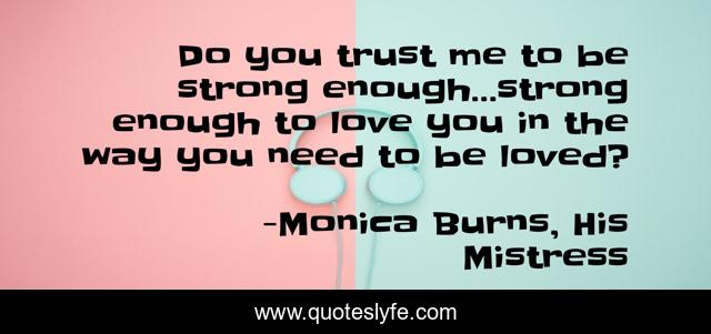This page presents the quote "Do you trust me to be strong enough…strong enough to love you in the way you need to be loved?". Author of this quote is Monica Burns, His Mistress. This quote is about lovers, ultimate-love-question,.