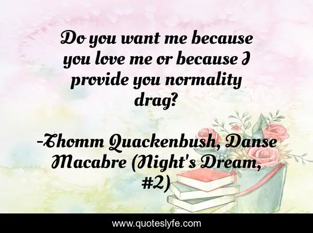 This page presents the quote "Do you want me because you love me or because I provide you normality drag?". Author of this quote is Thomm Quackenbush, Danse Macabre (Night's Dream, #2). This quote is about desire, relationships, love, affection, normal,.