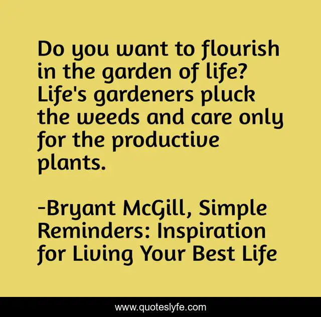 This page presents the quote "Do you want to flourish in the garden of life? Life's gardeners pluck the weeds and care only for the productive plants.". Author of this quote is Bryant McGill, Simple Reminders: Inspiration for Living Your Best Life. This quote is about flourish, life, productivity, teaching,.