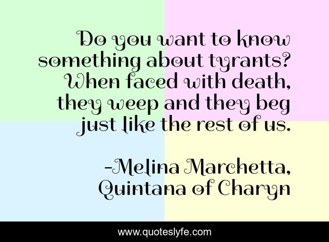 This page presents the quote "Do you want to know something about tyrants? When faced with death, they weep and they beg just like the rest of us.". Author of this quote is Melina Marchetta, Quintana of Charyn. This quote is about death, tyrants,.