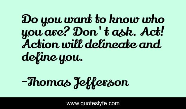 This page presents the quote "Do you want to know who you are? Don't ask. Act! Action will delineate and define you.". Author of this quote is Thomas Jefferson. This quote is about motivation, inspiration,.