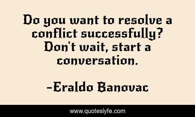 This page presents the quote "Do you want to resolve a conflict successfully? Don't wait, start a conversation.". Author of this quote is Eraldo Banovac. This quote is about life, sociology, positive, motivational, confidence, conversation, organizational-behavior, optimistic, inspirational,.
