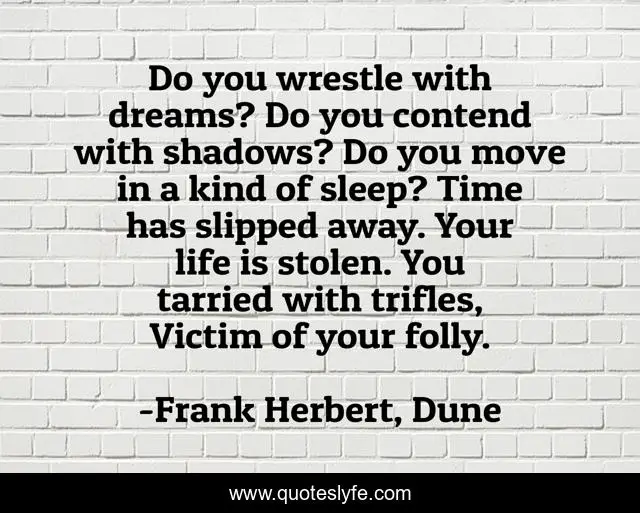 This page presents the quote "Do you wrestle with dreams? Do you contend with shadows? Do you move in a kind of sleep? Time has slipped away. Your life is stolen. You tarried with trifles, Victim of your folly.". Author of this quote is Frank Herbert, Dune. This quote is about death, song,.