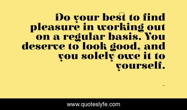 This page presents the quote "Do your best to find pleasure in working out on a regular basis. You deserve to look good, and you solely owe it to yourself.". Author of this quote is . This quote is about feeling-good, looking-good, edmond-mbiaka, working-out-on-a-regular-basis, working-out, find-pleasure-in-working-out,.