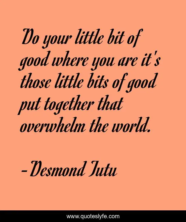 This page presents the quote "Do your little bit of good where you are it's those little bits of good put together that overwhelm the world.". Author of this quote is Desmond Tutu. This quote is about world, good, together,.
