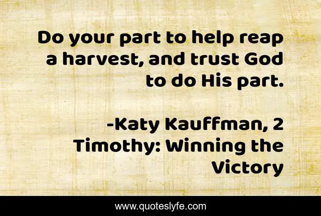 This page presents the quote "Do your part to help reap a harvest, and trust God to do His part.". Author of this quote is Katy Kauffman, 2 Timothy: Winning the Victory. This quote is about endurance, sharing-the-gospel, trusting-god,.